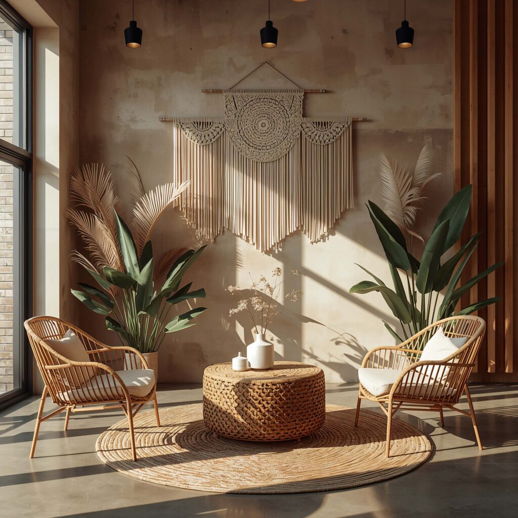 Start with natural materials. Think rattan furniture, jute rugs, and macramé wall hangings. Add plants – lots of them. Hanging planters, floor plants, desk succulents – go wild. The more greenery, the better the energy feels.