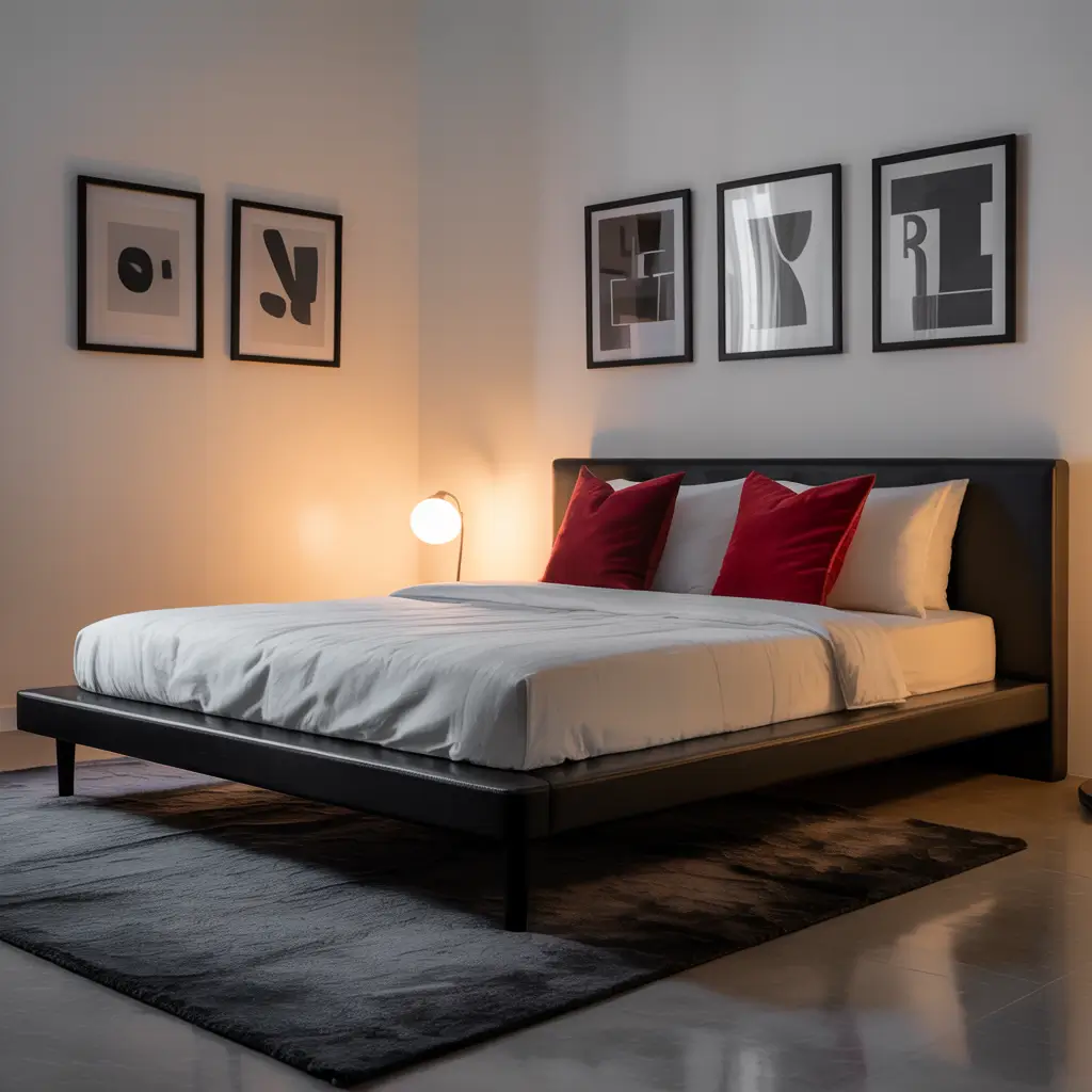 Start with a crisp white base and layer in black furniture with sharp, geometric shapes. Think platform beds with no-nonsense frames and sleek nightstands that practically float against the wall. Now here’s where the magic happens: add precisely one or two red elements. Maybe it’s a single abstract painting above the bed or a pair of crimson throw pillows that look like they cost more than your monthly rent (even if they didn’t).