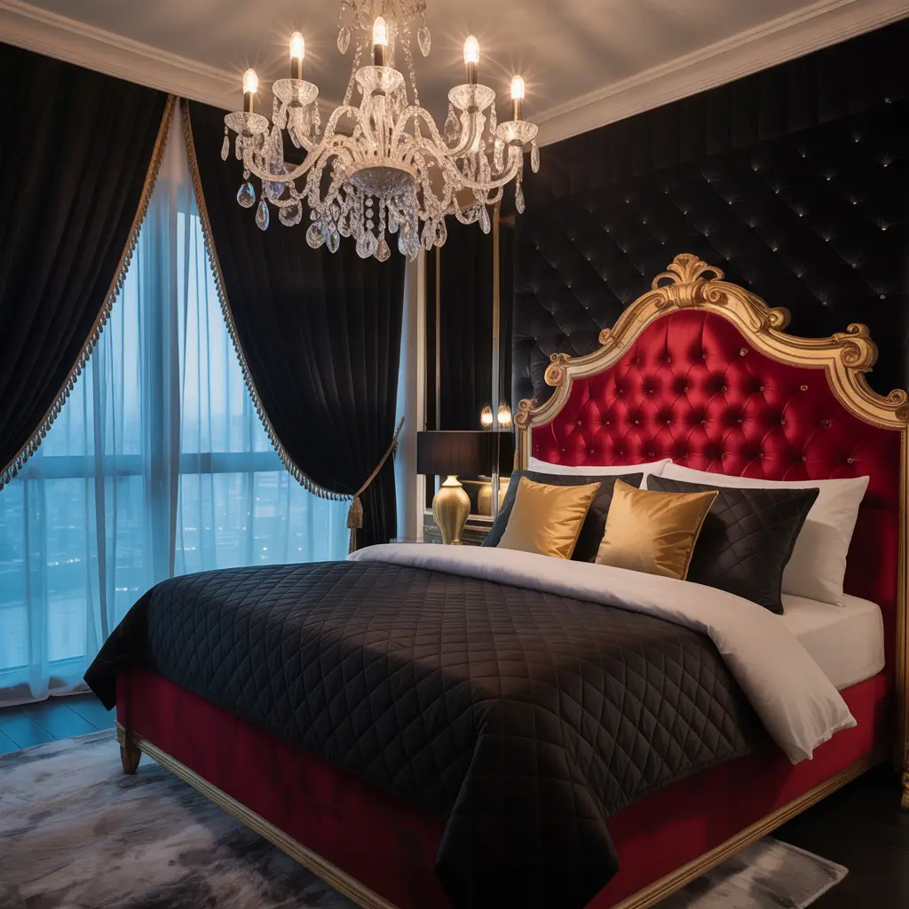 Let’s talk about texture, baby. Red velvet paired with black creates an atmosphere so luxurious, you’ll feel like you should be wearing a smoking jacket to bed. We’re channeling old Hollywood glamour meets modern sophistication here.