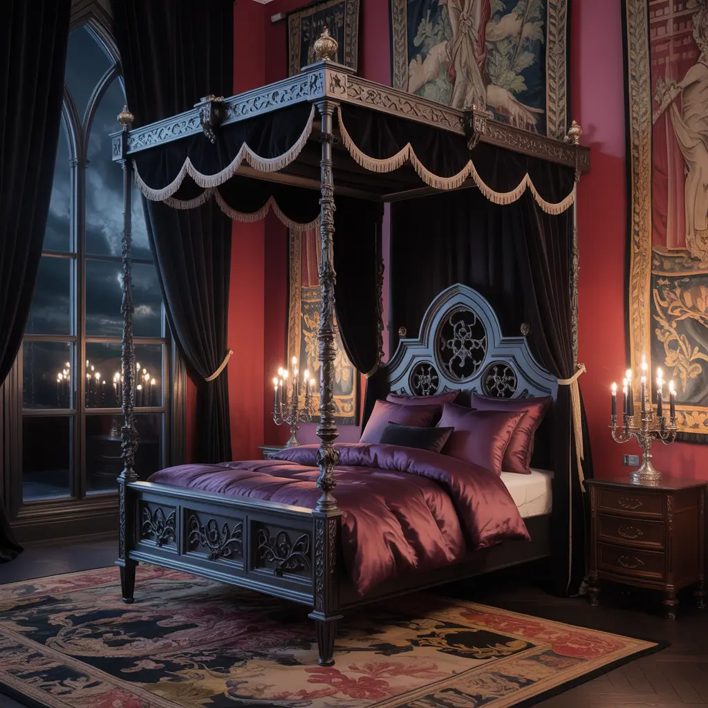 Ready to embrace your dark side? A gothic-inspired bedroom takes red and black to their dramatic extreme, and honestly, it’s not as scary as it sounds. Think Victorian elegance meets modern edge.