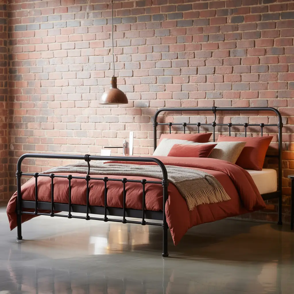 Black metal bed frames with clean lines anchor the space. Add red through textiles – think chunky knit throws, leather accent chairs, or area rugs with geometric patterns. The contrast between soft red fabrics and hard black metal creates visual interest that never gets old.