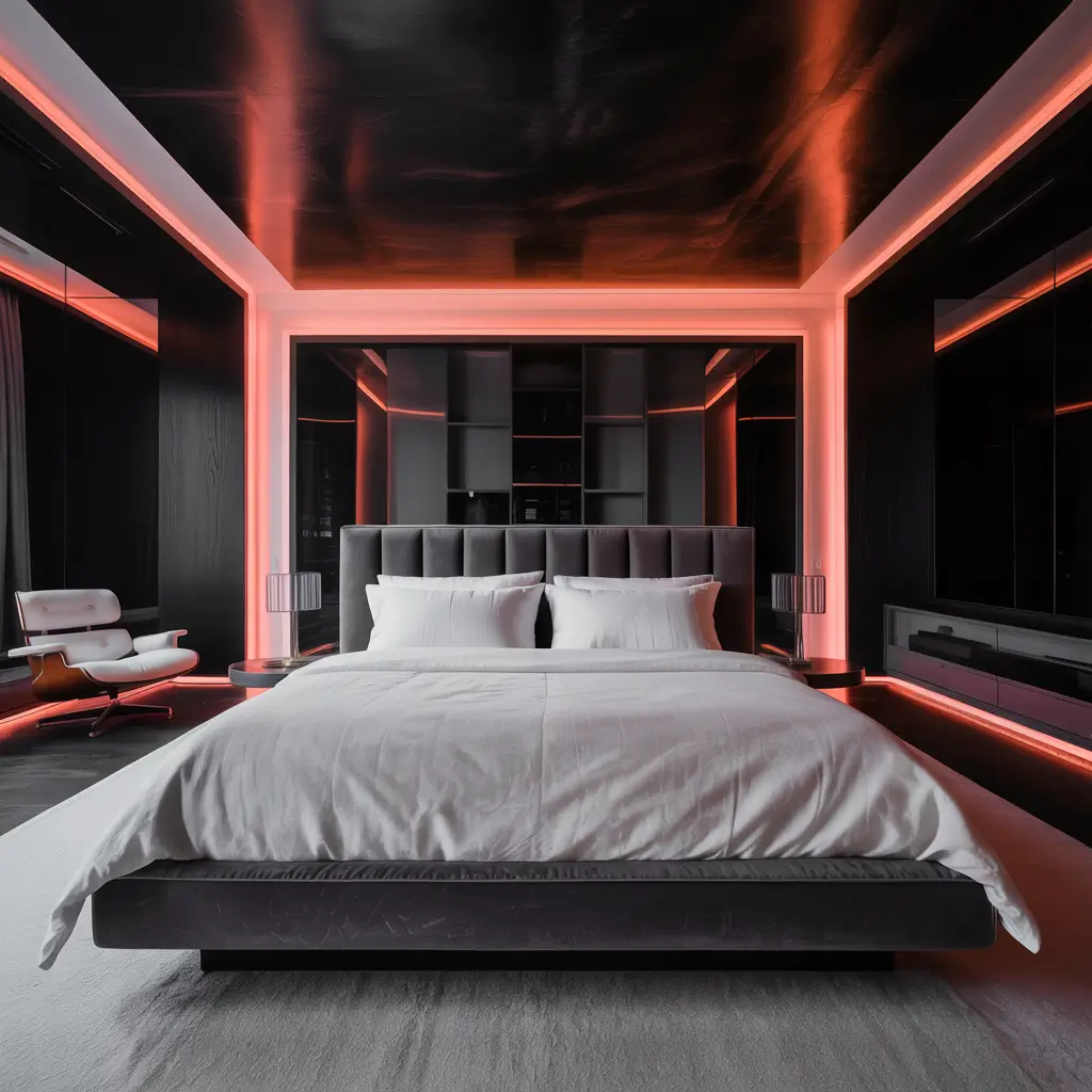 Black Ceiling with Red Lighting Bedroom