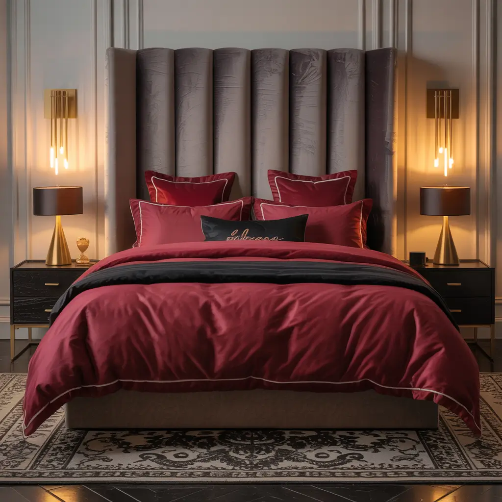 Start with a velvet upholstered headboard in deep red – the kind that makes you want to run your hands over it every time you pass by. Pair it with crisp black sheets and a quilted black coverlet for contrast. The magic happens when light hits that velvet, creating depth and richness you just can’t get with flat fabrics.
