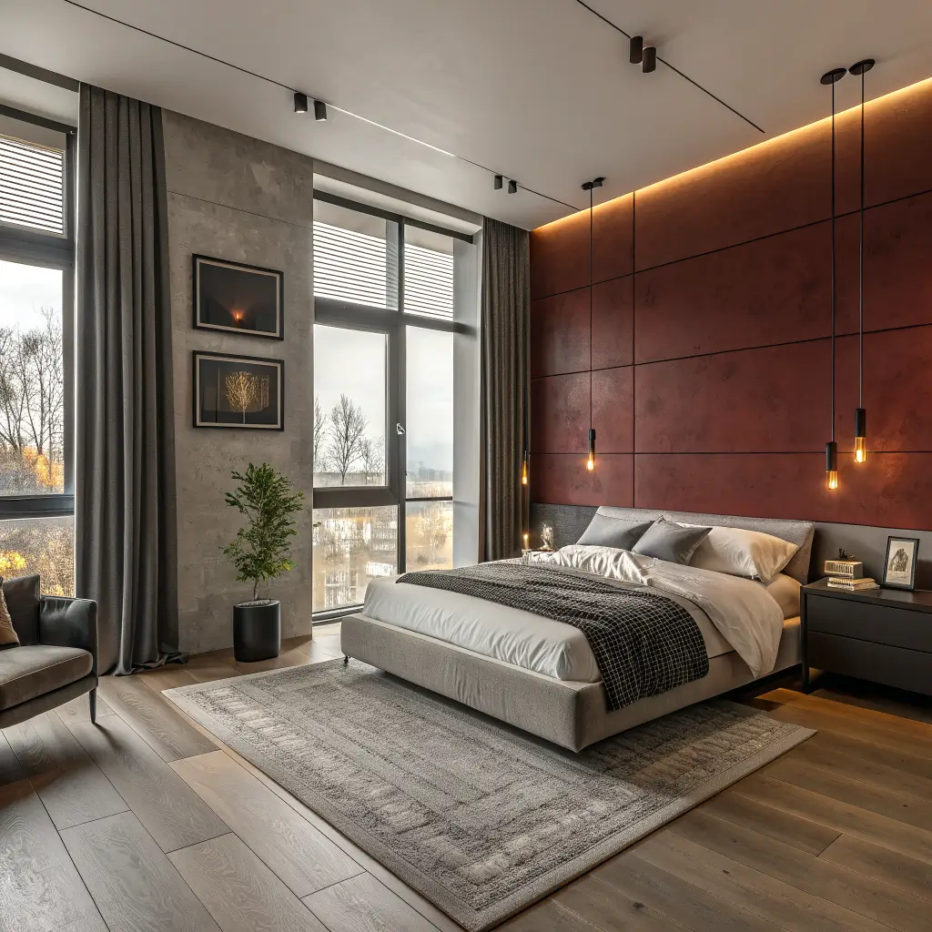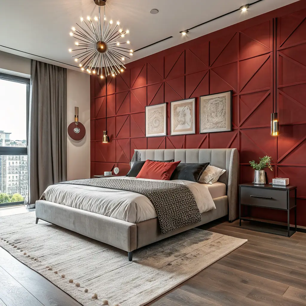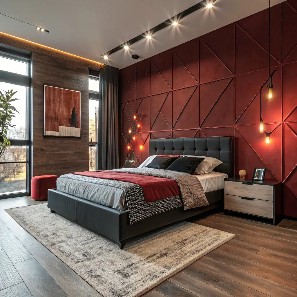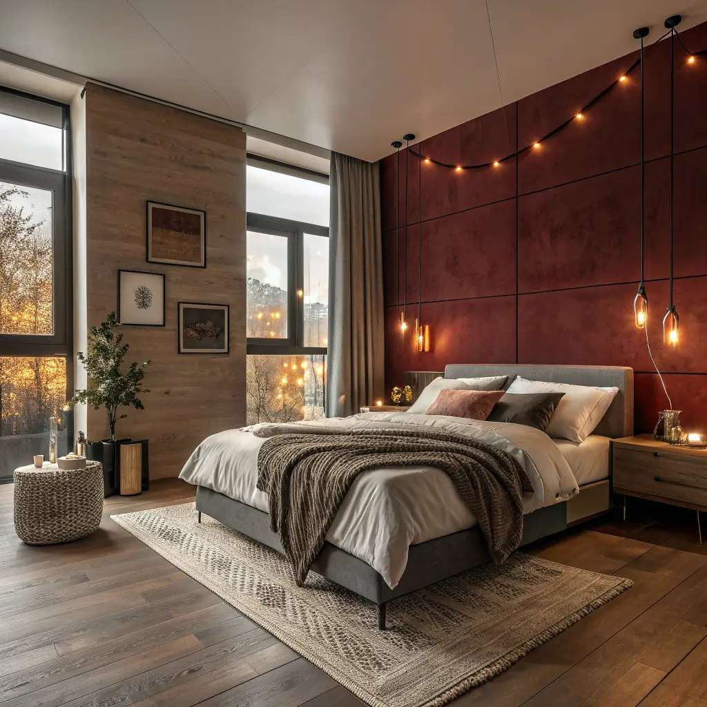 12. Red and Wood Warm-Tone Bedroom