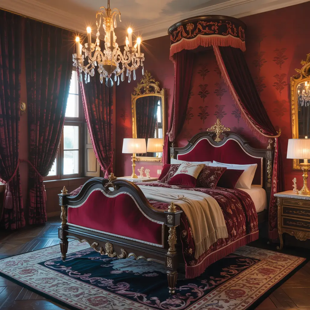 - Deep red walls or wallpaper (damask patterns work)
