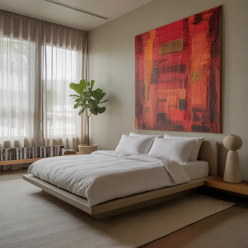 This aesthetic turns your bedroom into a livable art piece where red is the star. I started collecting red abstract art, and now my bedroom doubles as a personal gallery.
