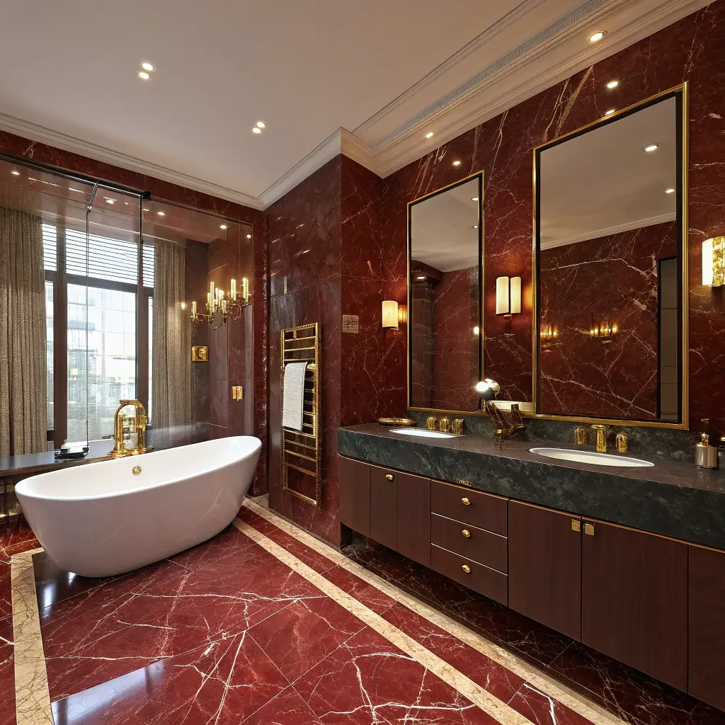 Classic red marble bathrooms embrace ornate details and traditional fixtures. I designed one with Rosso Francia marble, clawfoot tub, and vintage brass fixtures. The space feels like stepping into European luxury.