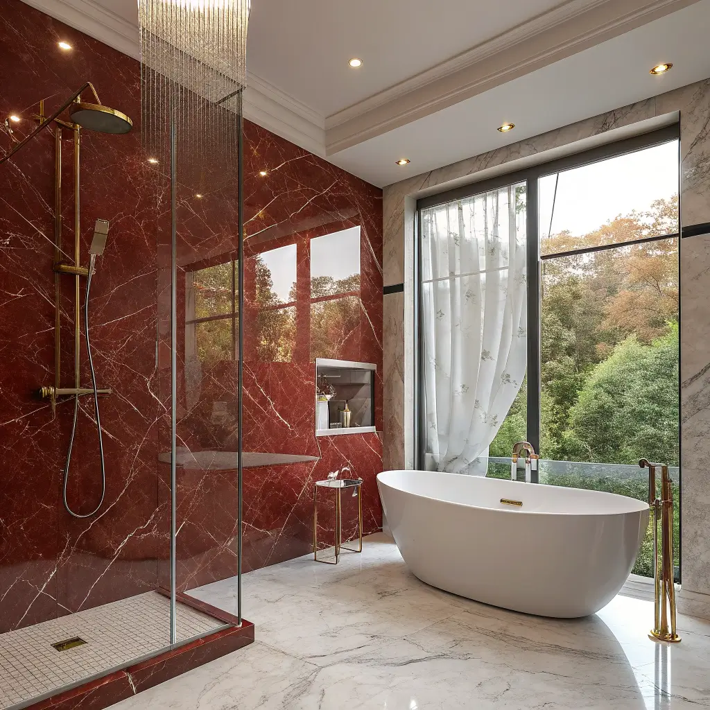 Book-match red marble slabs in the shower for maximum drama. The mirrored veining creates symmetrical patterns that look intentionally artistic. I did this behind my freestanding tub, and the effect is absolutely stunning.