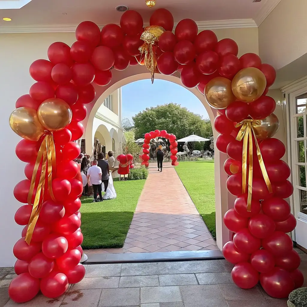 I always recommend using different shades of red instead of one flat tone. Mix scarlet, ruby, cherry, and burgundy balloons for a fuller, more stylish look. Add a few metallic gold balloons if you want extra shine without turning the whole setup into a holiday accident.