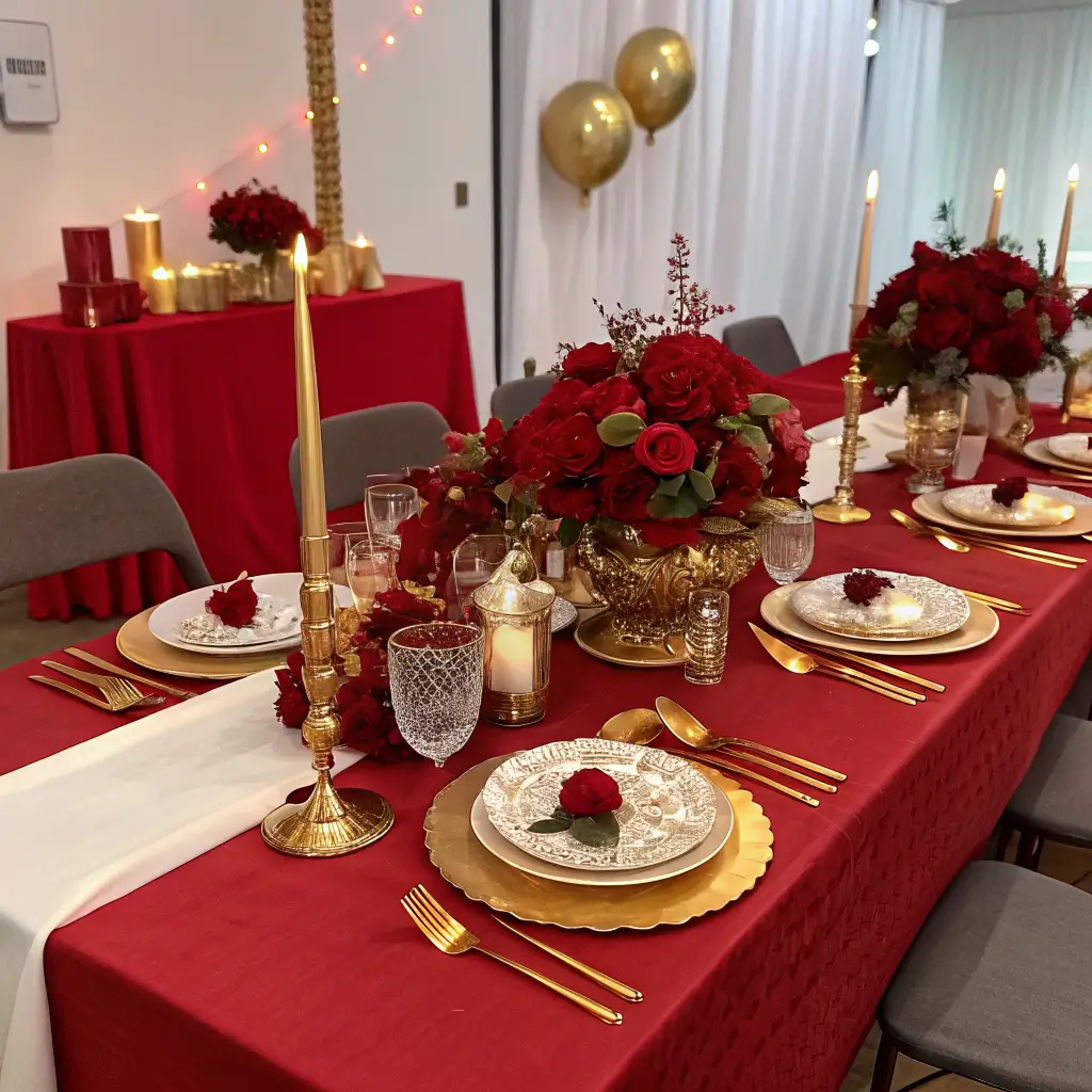 Start with a scarlet tablecloth or table runner. Then layer in gold charger plates, cutlery, candle holders, or napkin rings. Red and gold birthday party decor always looks polished because the gold softens the intensity of the red.