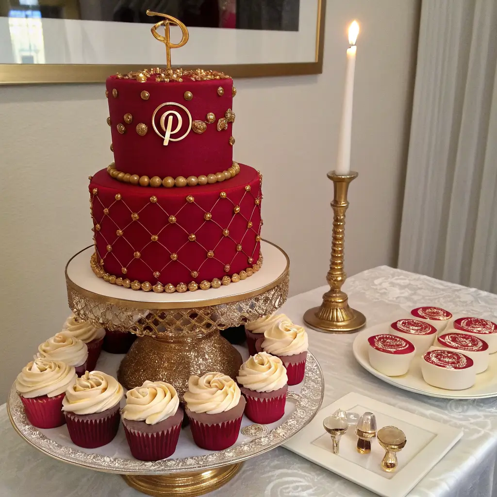 A ruby-themed cake and cupcake stand gives your dessert presentation a focal point with a little extra glam. The main cake already gets attention, so why not help it out with a setup that actually looks special? A plain folding table does not count, obviously.