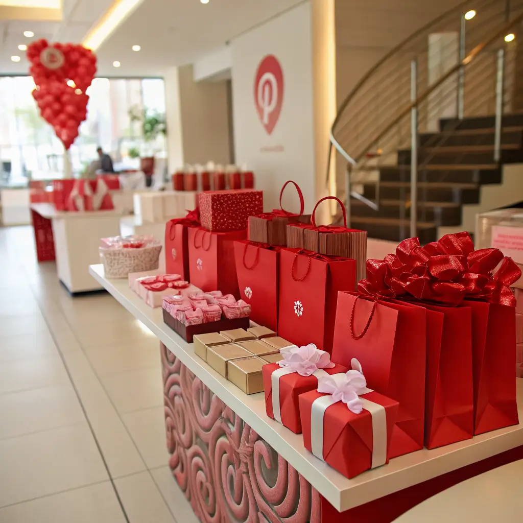 Set up a dedicated table or shelf with red gift bags, boxes, or baskets. Add a sign that invites guests to grab one before they leave. This display works best when you style it like a mini boutique instead of just stacking items in a sad pile.