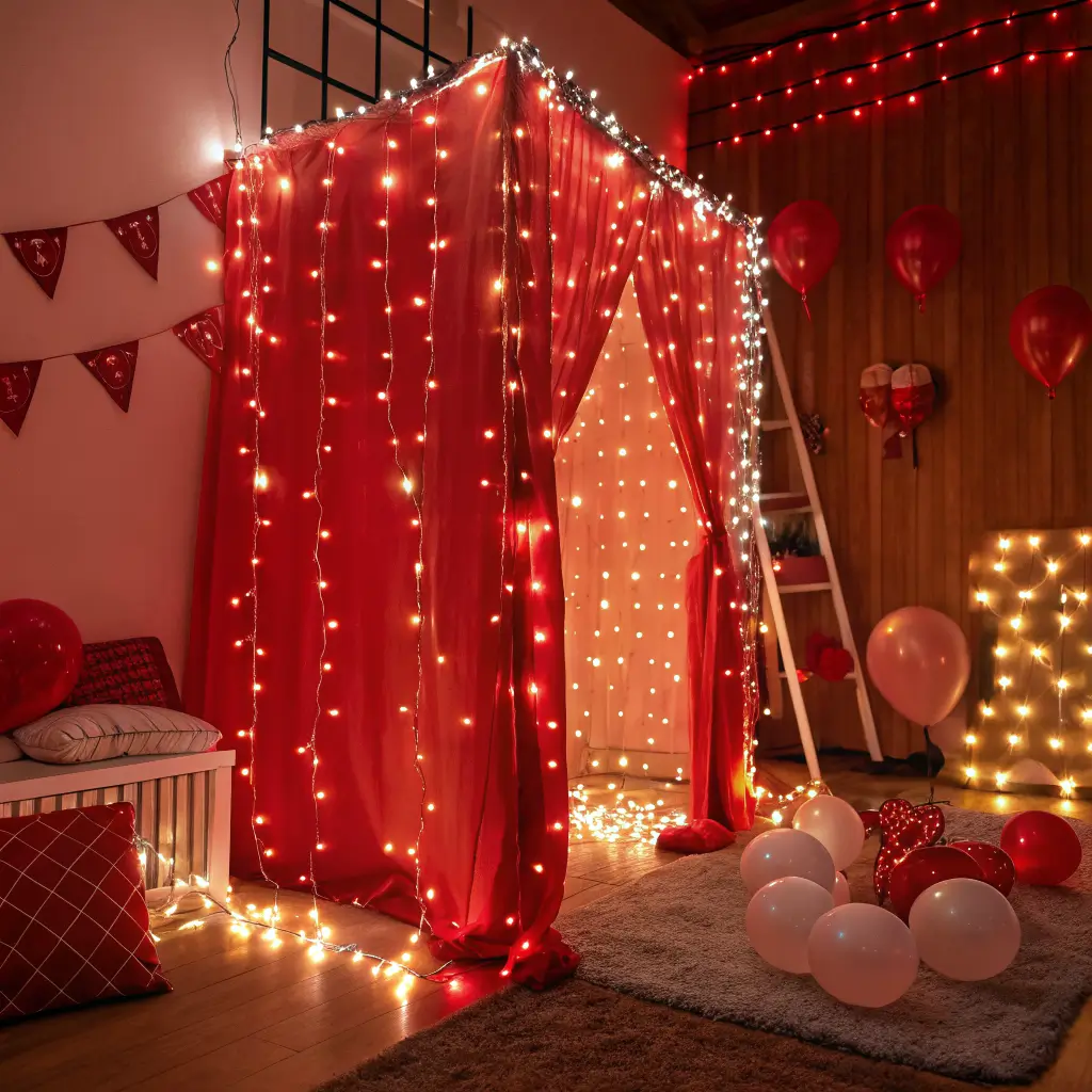 Drape red fairy lights along a backdrop, around a mirror, across a corner shelf, or behind sheer fabric. Add a chair, a neon sign, or a floral accent if you want a photo-ready nook. This setup feels dreamy without requiring a huge budget.