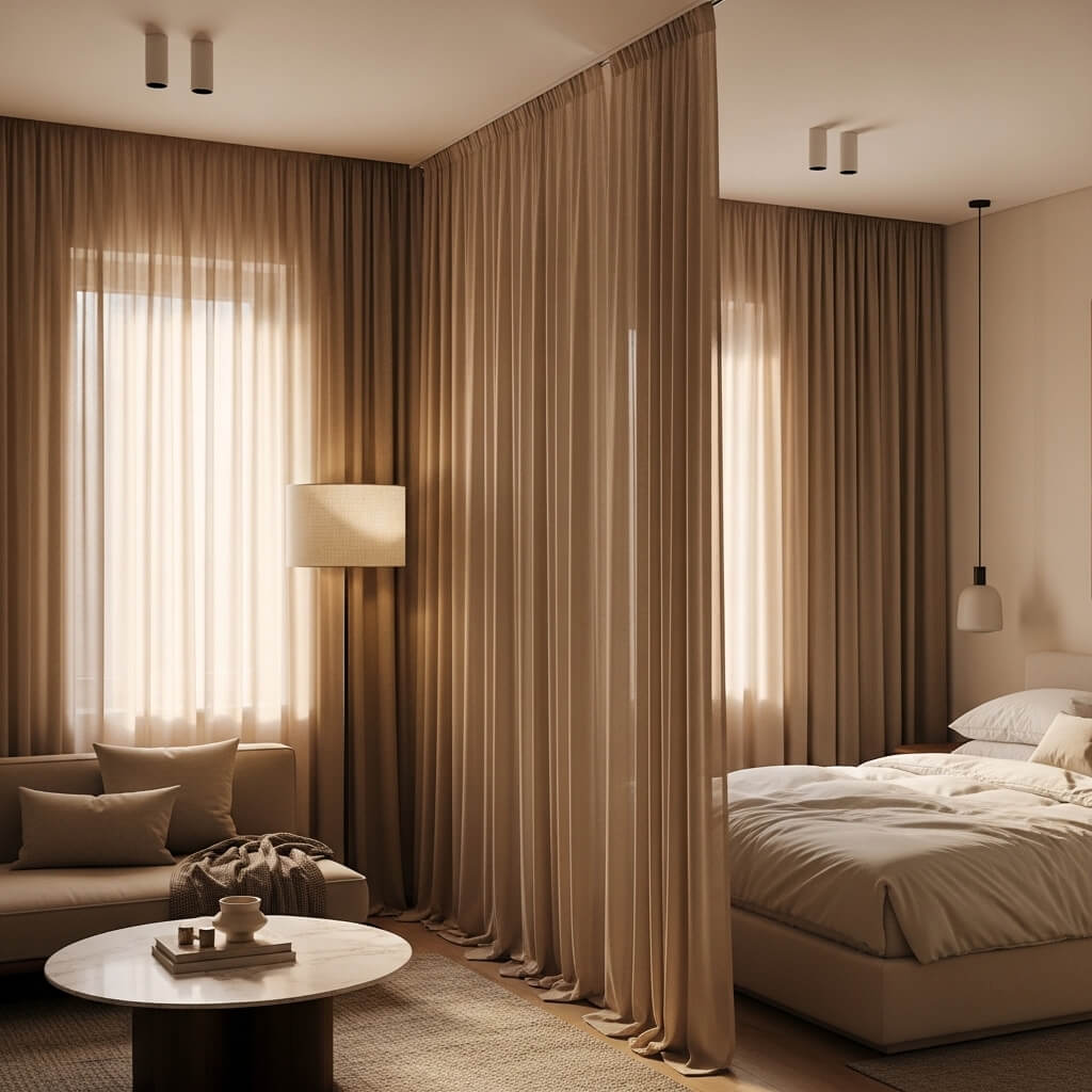 Last but definitely not least, we’ve got fabric panel ceiling track dividers—basically fancy curtains on steroids. These panels slide along ceiling-mounted tracks, giving you smooth operation and a clean, contemporary look. They’re particularly popular in studio apartments and open-plan homes where you need functional division without permanent walls.