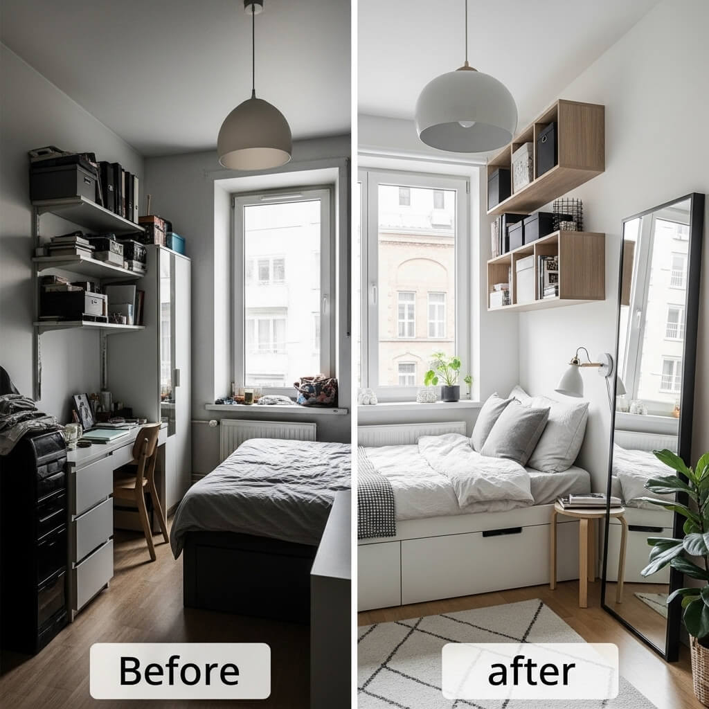 Mirrors are absolute game-changers for small spaces. They reflect light and create the illusion of depth, making your room feel twice as large. I hung a large mirror opposite my window, and the difference was incredible. The room felt brighter and more spacious instantly.