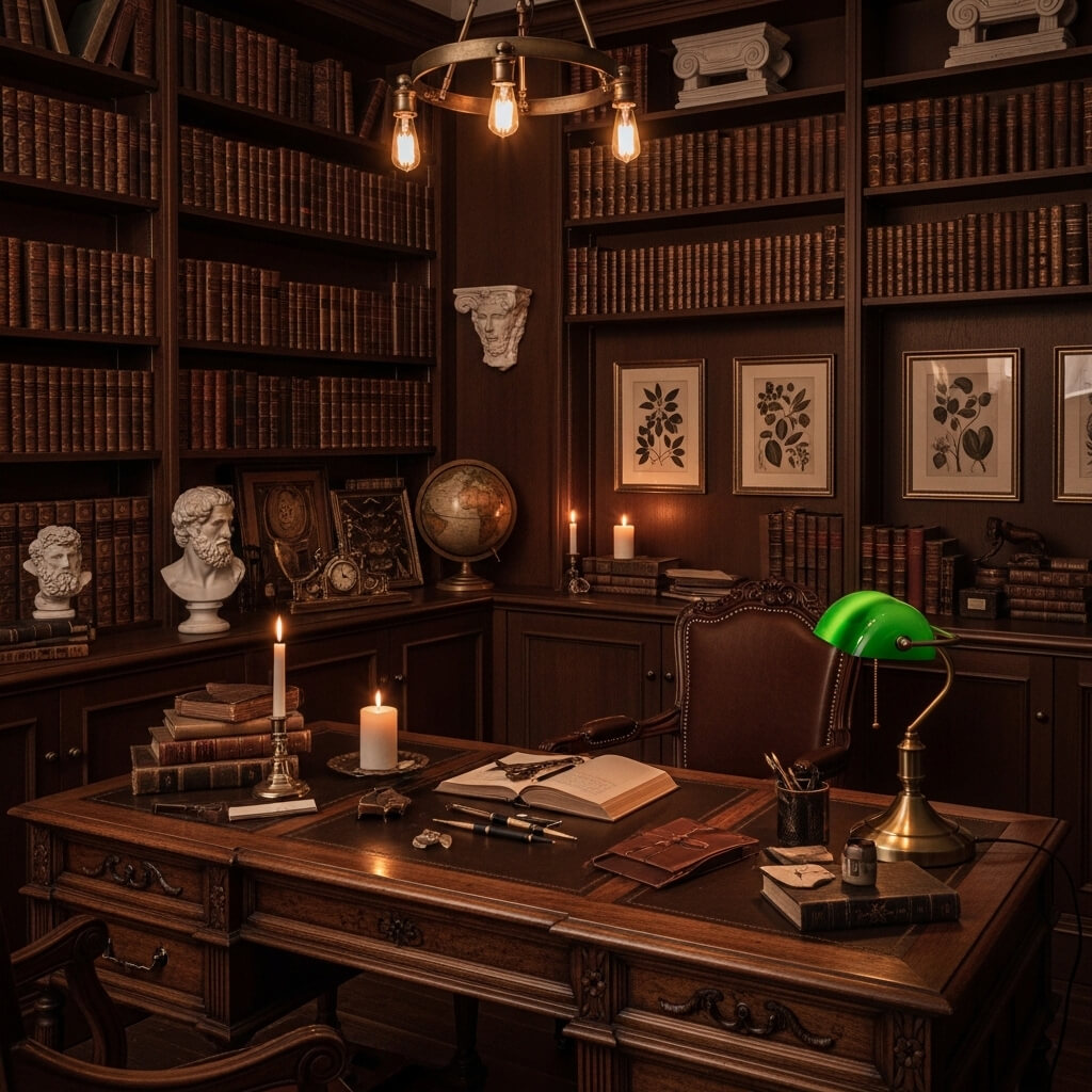 Moody lighting completes the look. Desk lamps with green glass shades, Edison bulb fixtures, and candles create that dim, atmospheric lighting. The goal isn’t bright and cheerful—it’s contemplative and slightly mysterious.