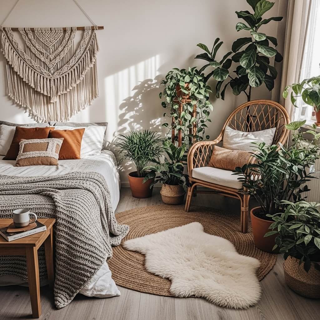Natural materials and earthy tones create the foundation. Rattan, macramé, wood, plants (so many plants), and natural fibers like cotton and linen are essential. When I started my boho bedroom, I hit up thrift stores for wicker baskets, wooden frames, and ceramic pots.