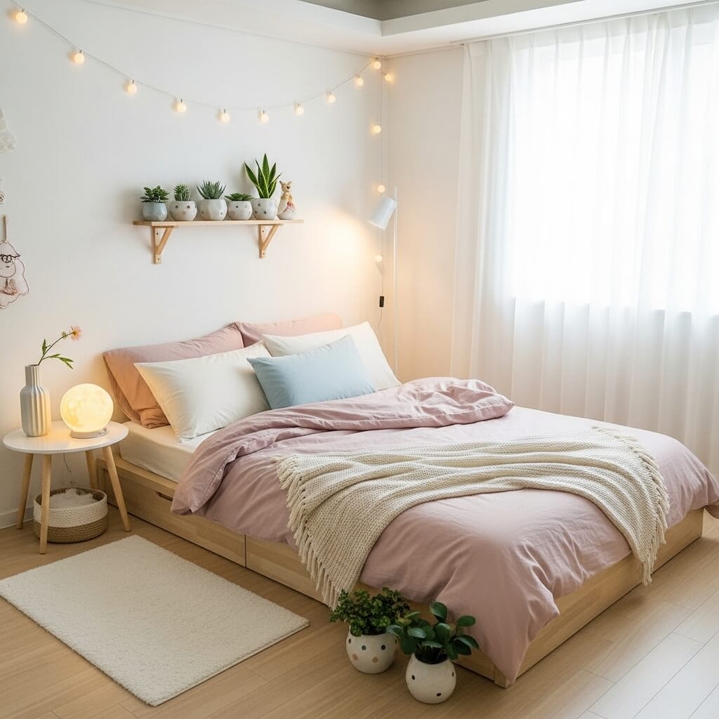 Low-profile furniture is characteristic of Korean style. Platform beds, floor cushions, and low tables create that signature look. I lowered my bed by removing the frame legs, and the entire room suddenly felt more spacious and grounded.