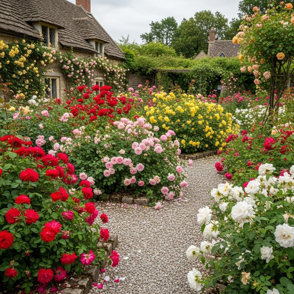 • Varied heights: Mix shrub roses, climbers, and standards for visual interest