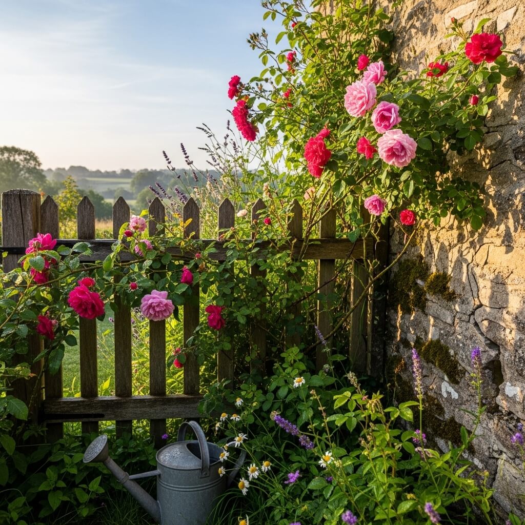 Choosing the right roses sets the entire tone. Old garden roses, species roses, and varieties with natural growth habits work best here. Avoid anything too perfect or formal – you want roses that look like they’ve been growing in that spot for generations.