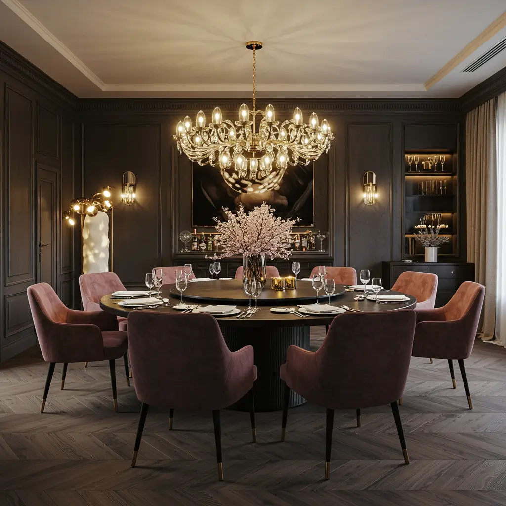 Elegant round tables with velvet seating create instant sophistication. The combination of a refined table with plush velvet chairs makes every meal feel like a special occasion, even when you’re eating leftover pizza.