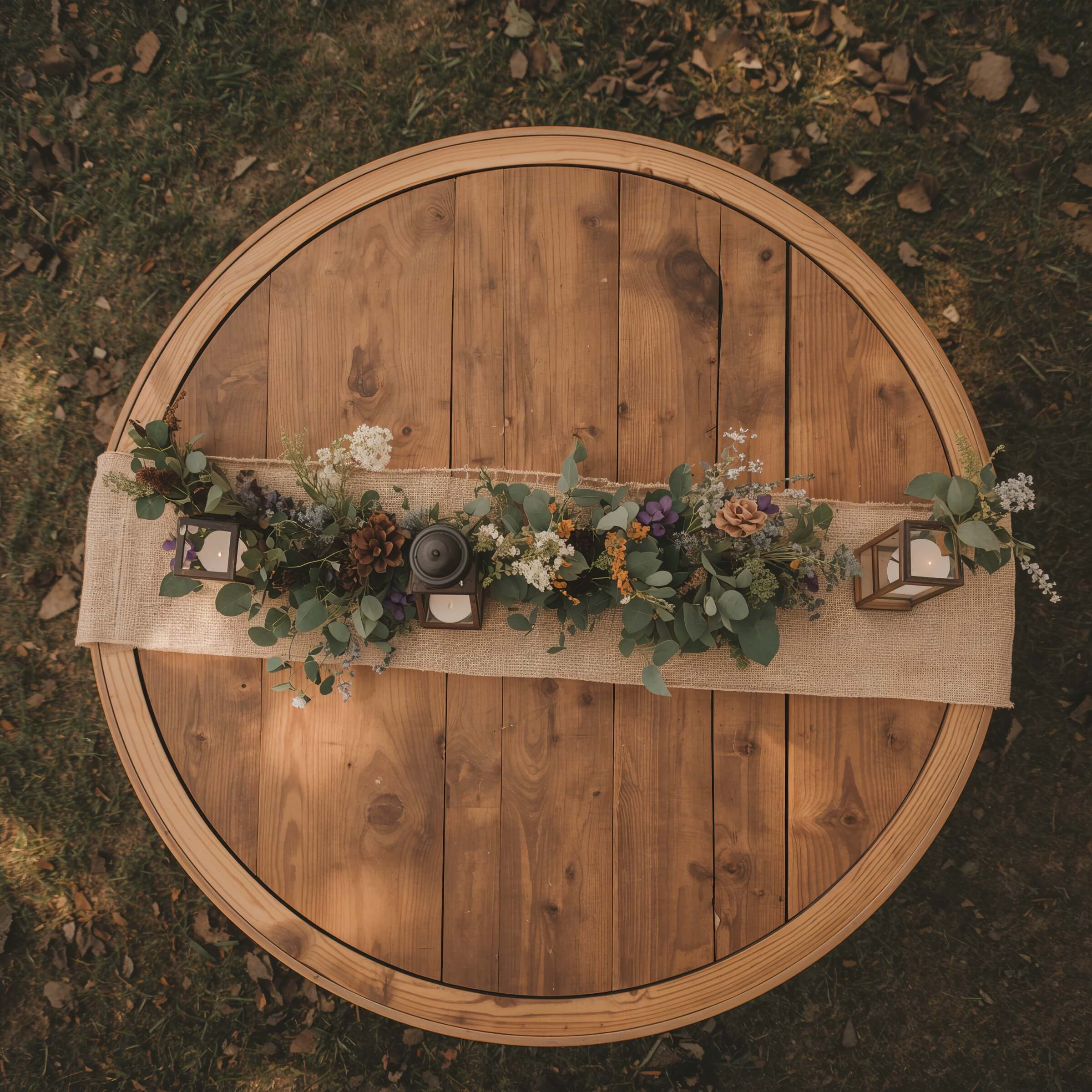 Choose lanterns in different sizes and finishes – maybe some distressed white, others in aged brass or black metal. Surround them with fresh eucalyptus garlands and add pillar candles inside the lanterns for that warm, inviting glow.