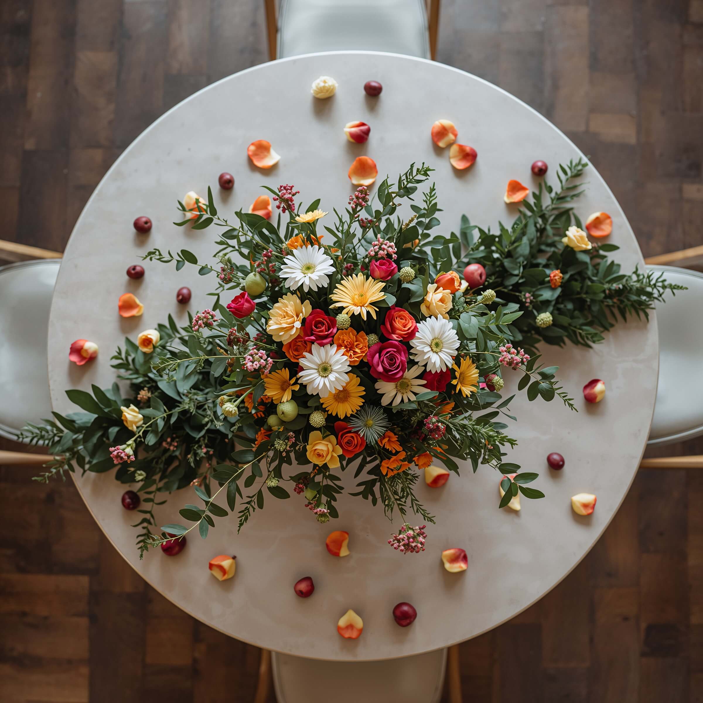 Blush and ivory petals with gold candles create timeless elegance. Deep red and burgundy with black candles add drama and sophistication. For something unexpected, try white petals with colored candles – maybe deep blue or emerald green for a modern twist.