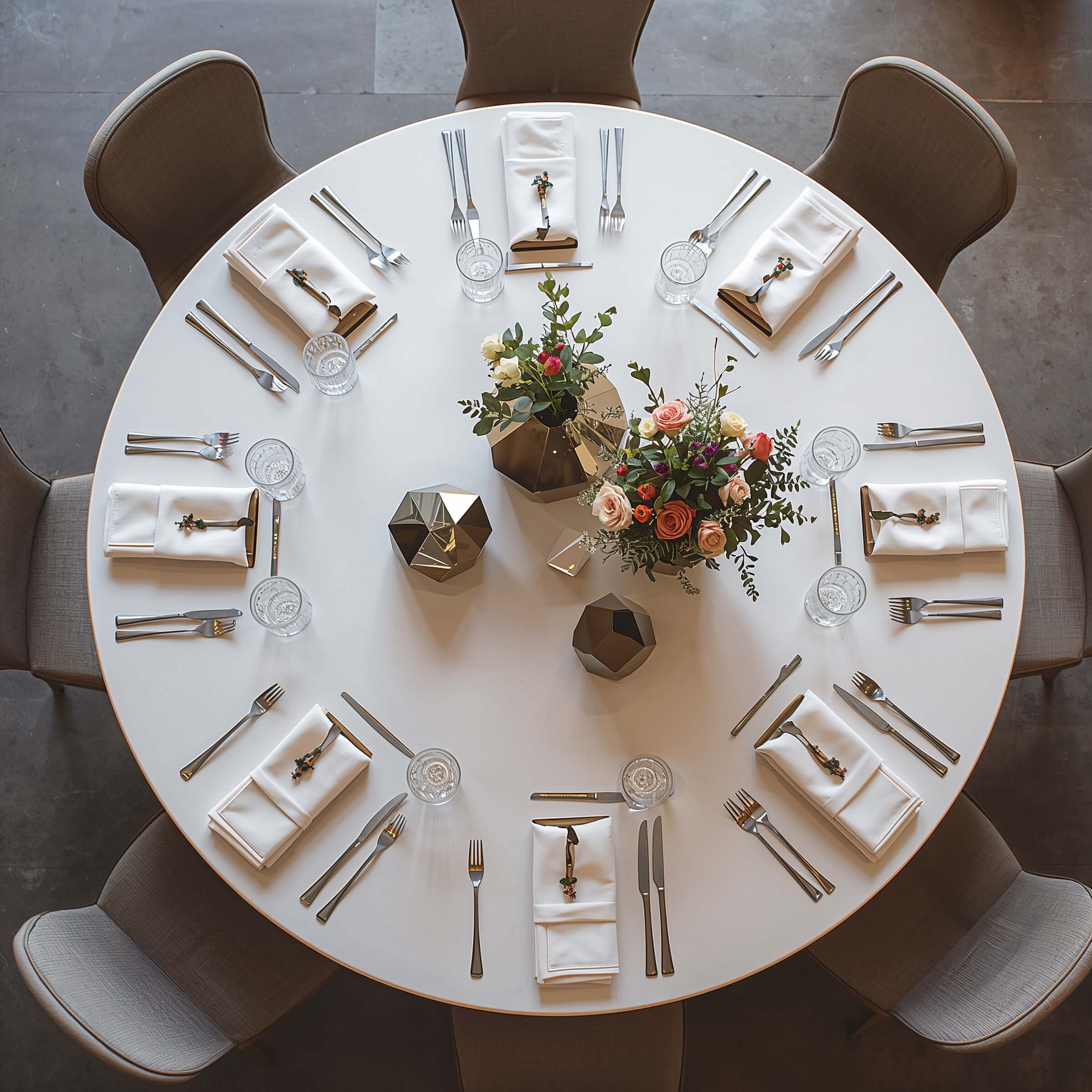 The trick with this dramatic look is balancing the strong geometric shapes with softer elements. Add flowing table runners in black or gold, incorporate round elements like candles or spherical vases, and use organic flowers to soften the angular lines.