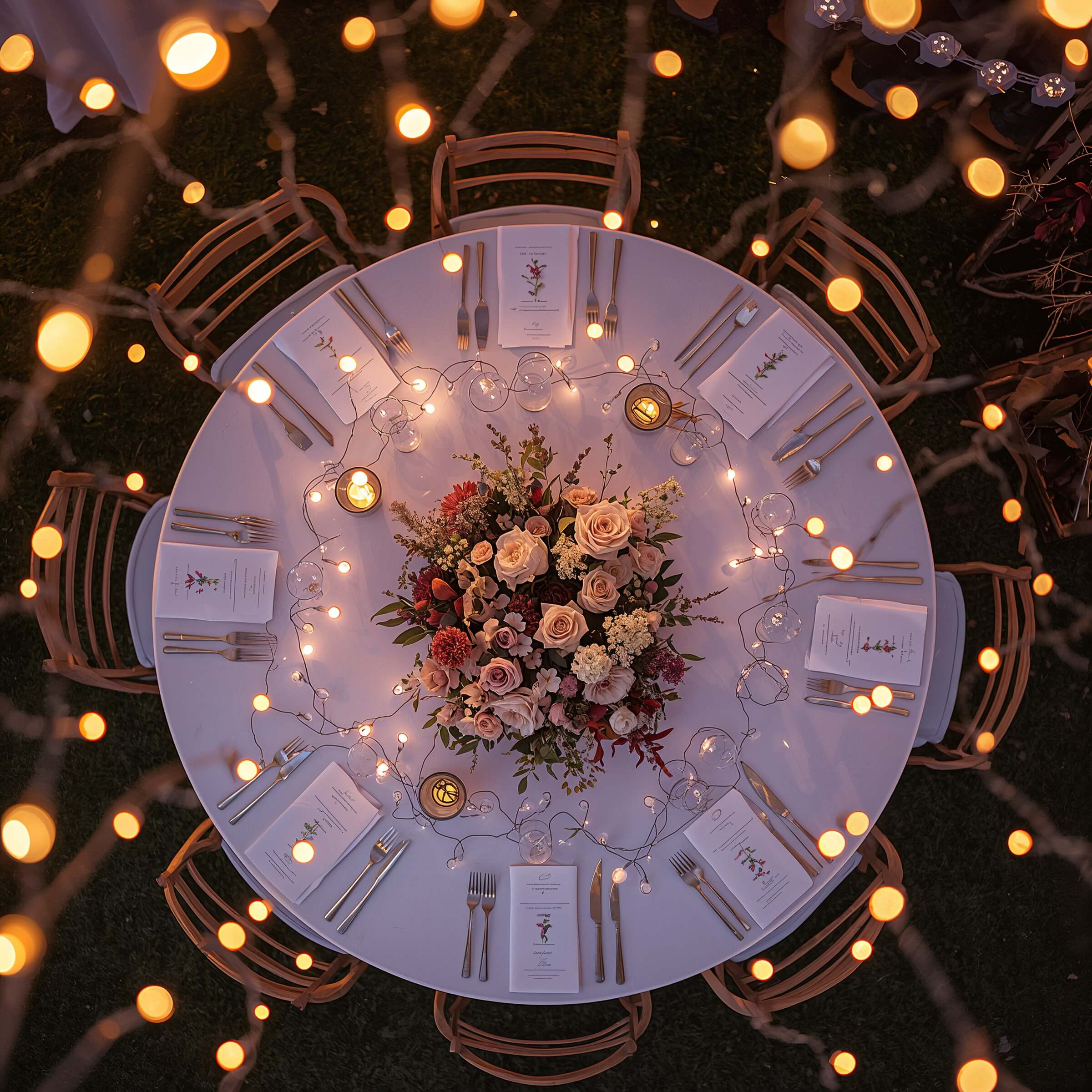 There’s something magical about fairy lights, and when you wrap them around vases or incorporate them into centerpieces, the effect is pure enchantment. This idea works for any style wedding but adds that special sparkle factor that makes everything feel more festive.