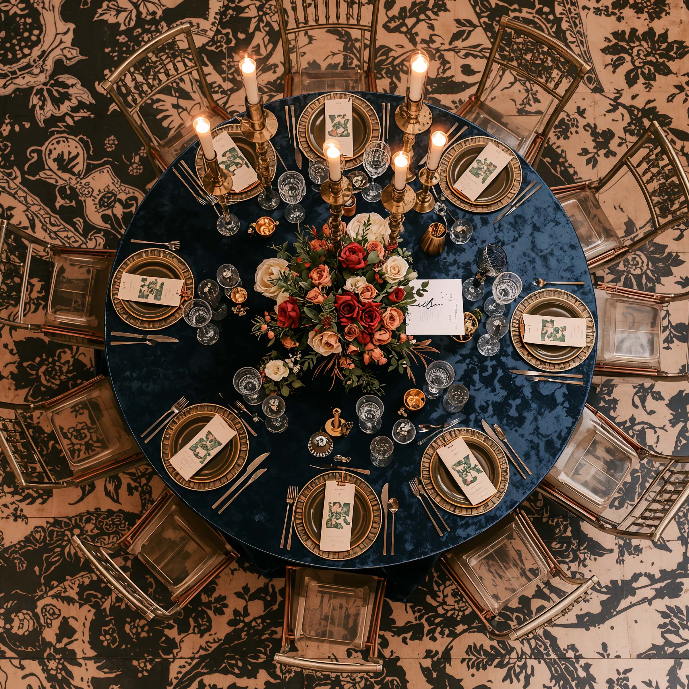 Lighting is crucial for this setup. The metallic elements need proper illumination to really shine, so consider uplighting or pin spots to highlight your centerpieces. Trust me, the photos will be incredible.