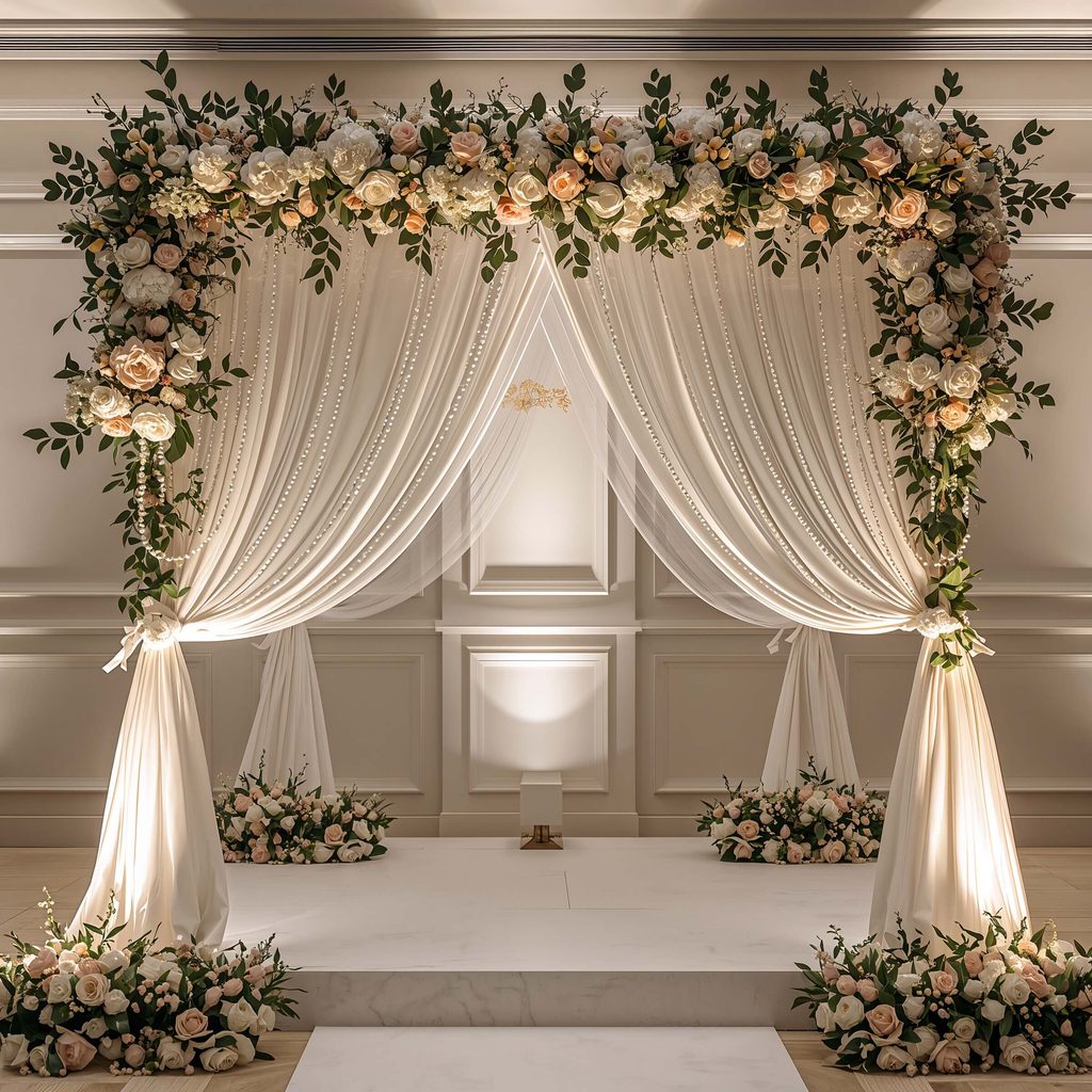 Create concentric circles of rose petals in complementary colors, with pillar candles or lanterns placed strategically throughout. The key is using enough petals to make a real impact – we’re talking luxury here, not sparse decoration.