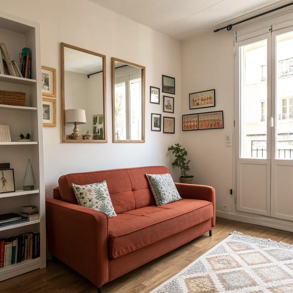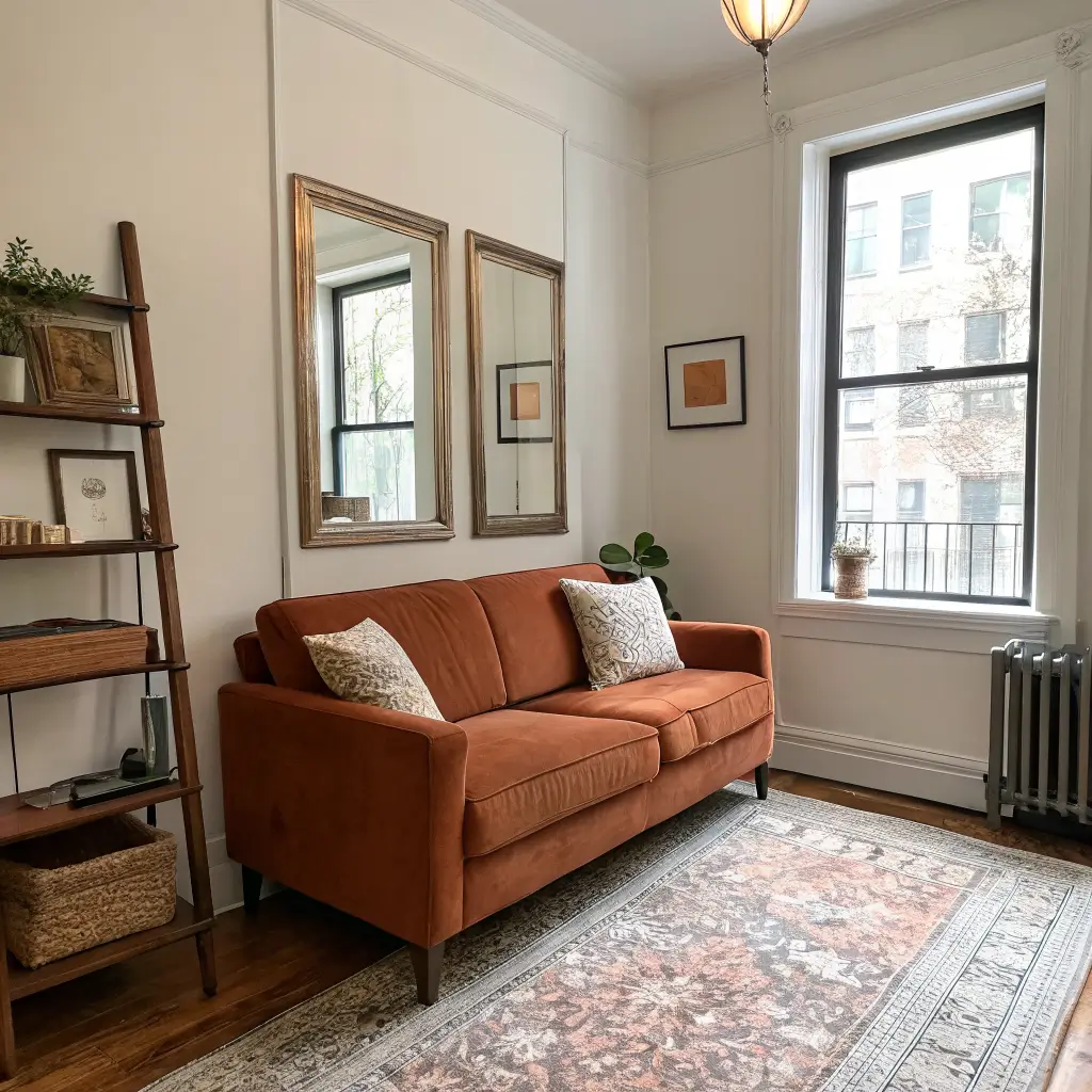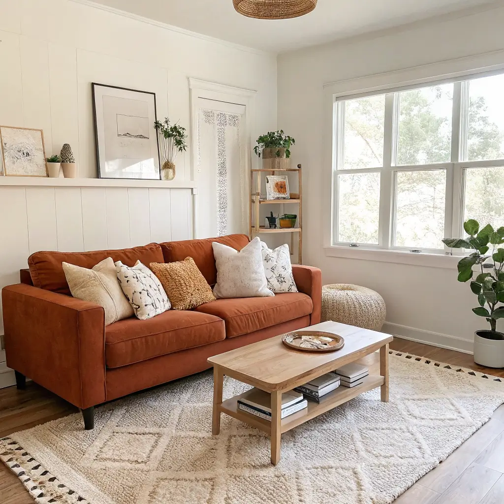 The magic is in making the rust couch the intentional focal point. Instead of trying to make it disappear, celebrate it. This gives your small space purpose and personality rather than feeling like you’re just trying to fit furniture in.