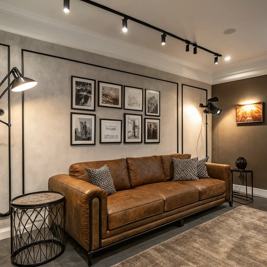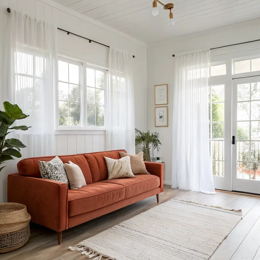 I recommend keeping other furniture pieces light and leggy. A glass coffee table, slim-legged chairs, and floating shelves maintain that airy feeling while your rust couch provides the visual weight the room needs.
