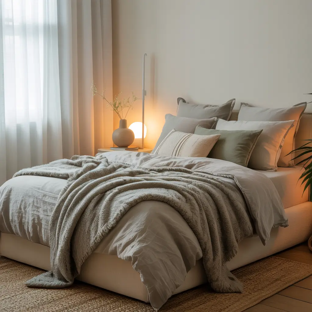 I’m currently rocking a dove grey duvet with two sage green throw blankets – one chunky knit for texture and one linen for that effortless, lived-in vibe. The combination makes my bed look like something from a fancy hotel, except way more comfortable because I actually sleep there.