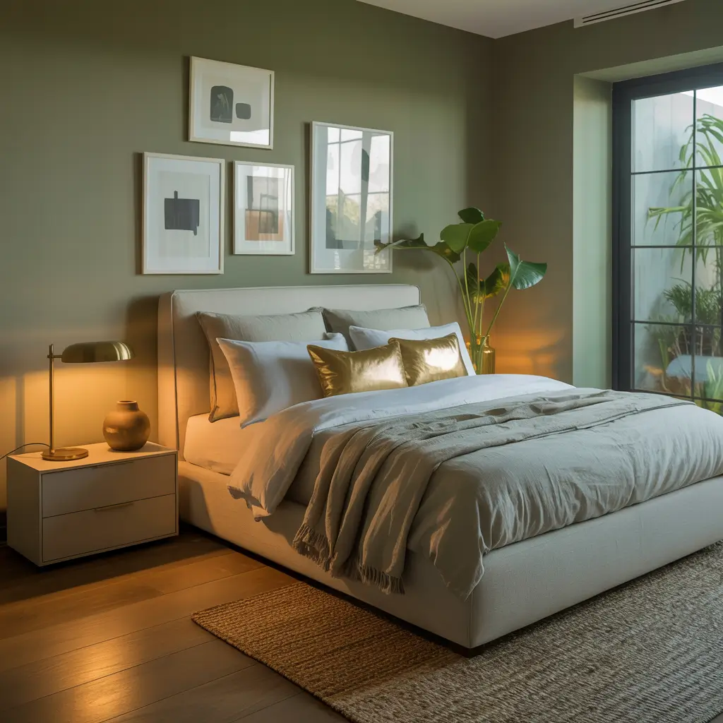 10. Modern Sage Green and Grey Bedroom with Metallic Accents