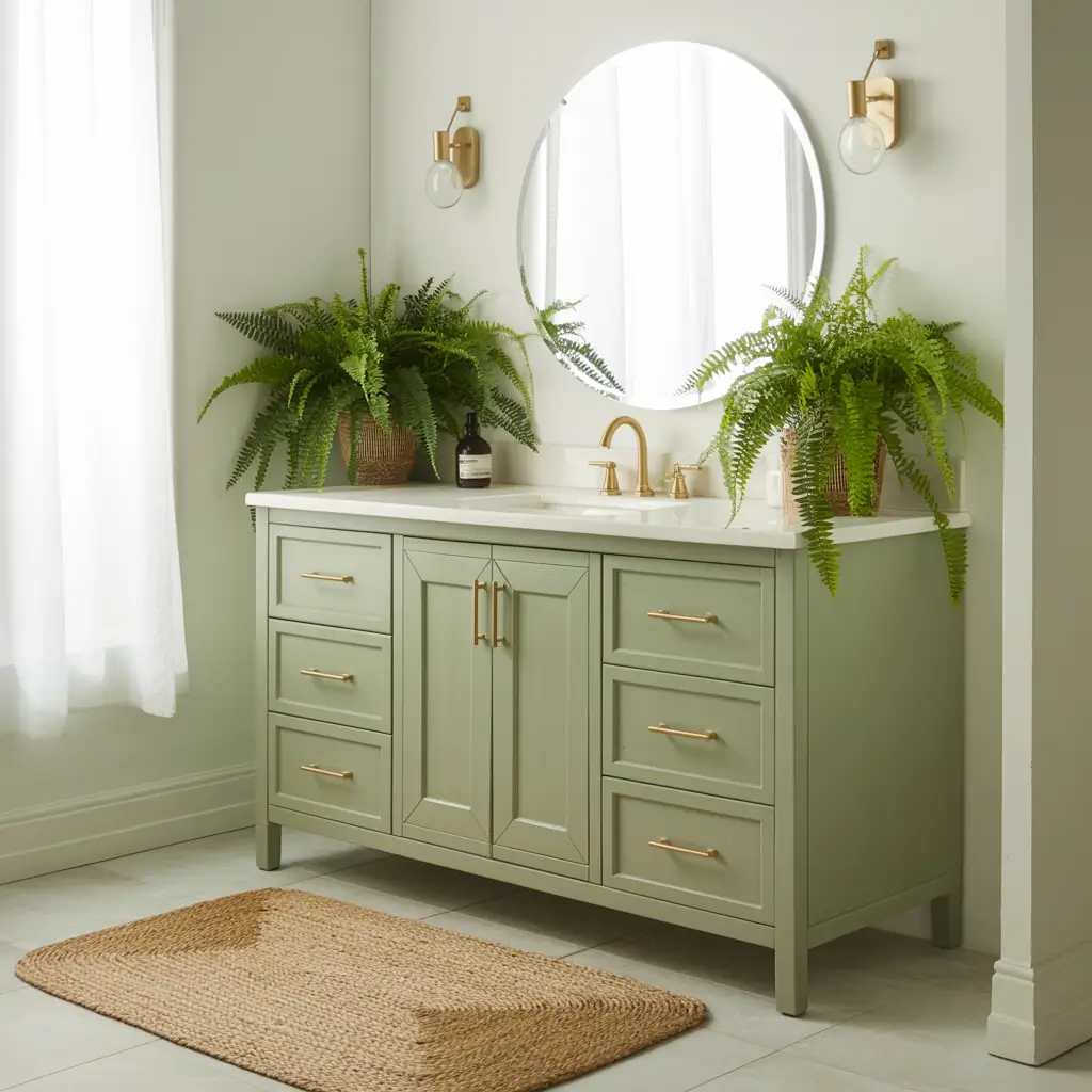 Can’t commit to sage green walls? Start with a sage green vanity. This approach gives you that pop of color without the full room commitment, and it’s way easier to change if you get tired of it (though trust me, you won’t).