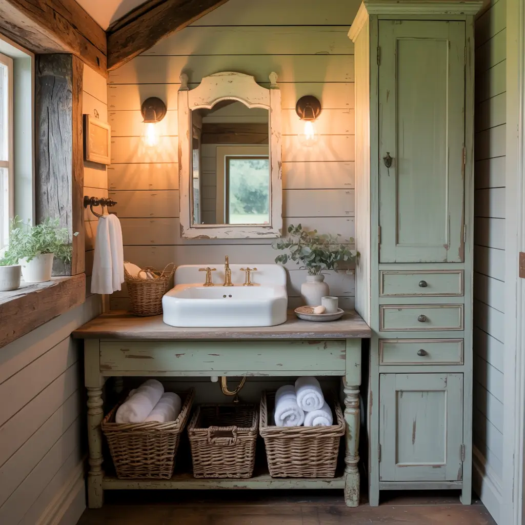 Who says farmhouse style has to be all shiplap and mason jars? Sage green brings a fresh twist to rustic bathrooms that feels both timeless and totally current. This style works especially well if you’re dealing with an older home that already has some character.
