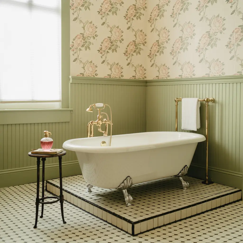 The vintage approach relies heavily on the details. Think hexagonal floor tiles, pedestal sinks, and those gorgeous vintage-style faucets with the crosshead handles. But here’s where it gets interesting: sage green prevents this look from feeling like a museum piece.