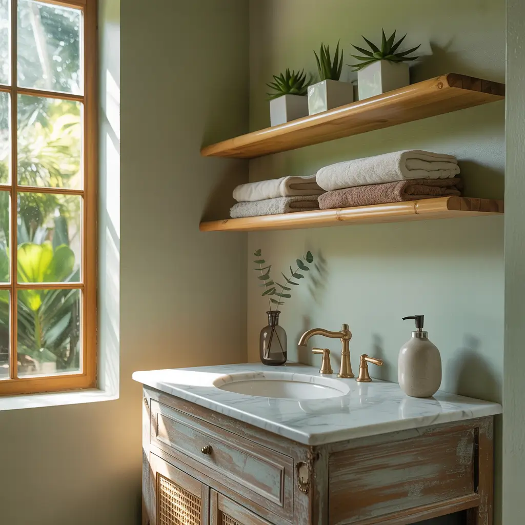 What really sells this look? The imperfection. Your towels don’t all need to match perfectly, and that slightly crooked mirror adds character. The sage green acts as your neutral base that ties all these eclectic elements together.