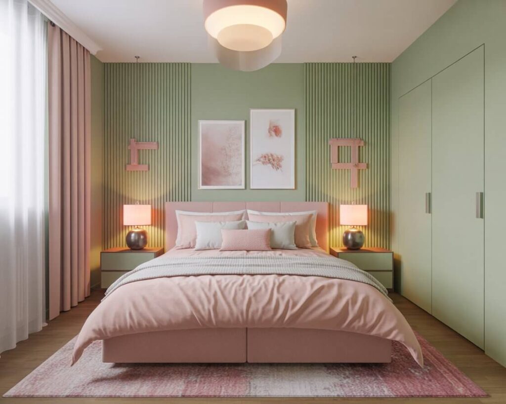 - Blush bedding with sage walls