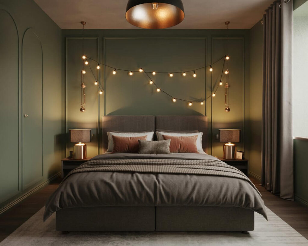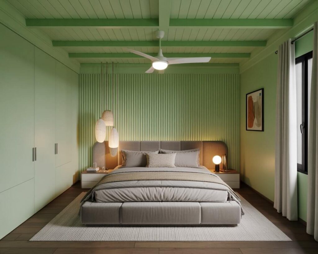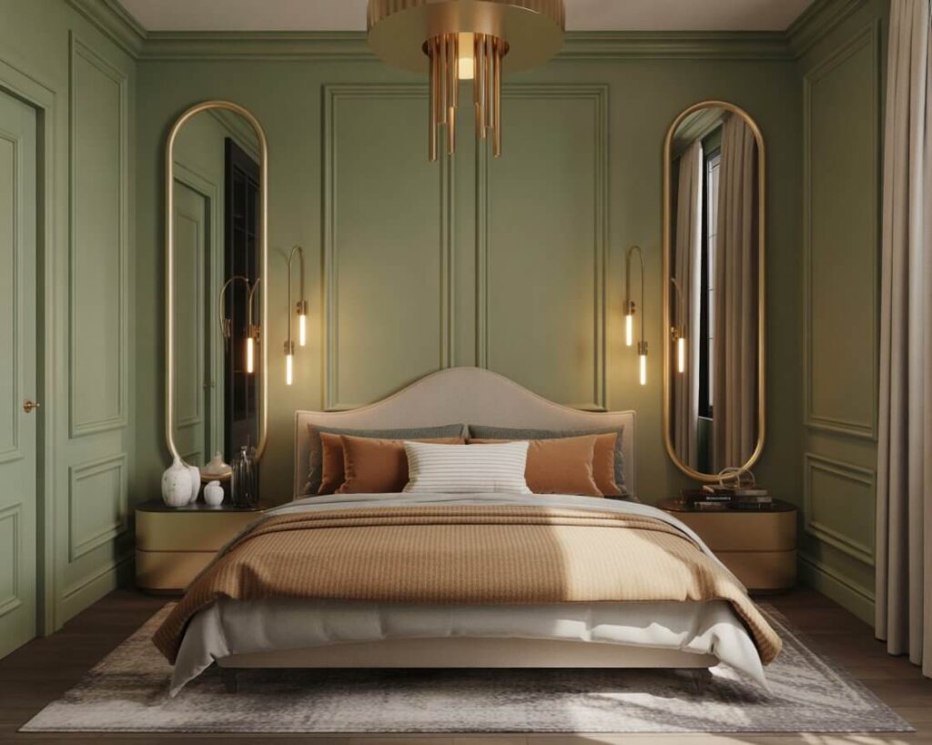 Ready to go bold? Dark sage green creates a moody, sophisticated atmosphere that’s perfect for those who want drama without going full goth. This deeper shade works especially well in bedrooms with lots of natural light.