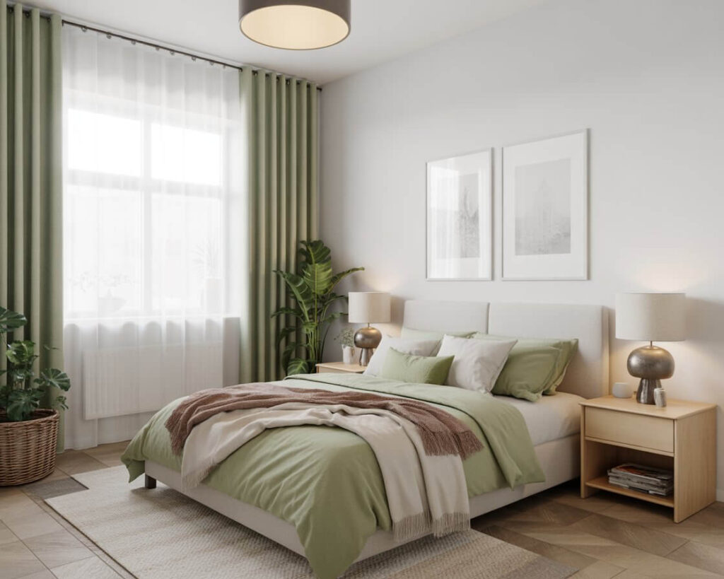 Sometimes the best combinations are the subtle ones. Sage green with beige creates an incredibly calming, neutral palette that never goes out of style. This combo works in literally any bedroom size or style.