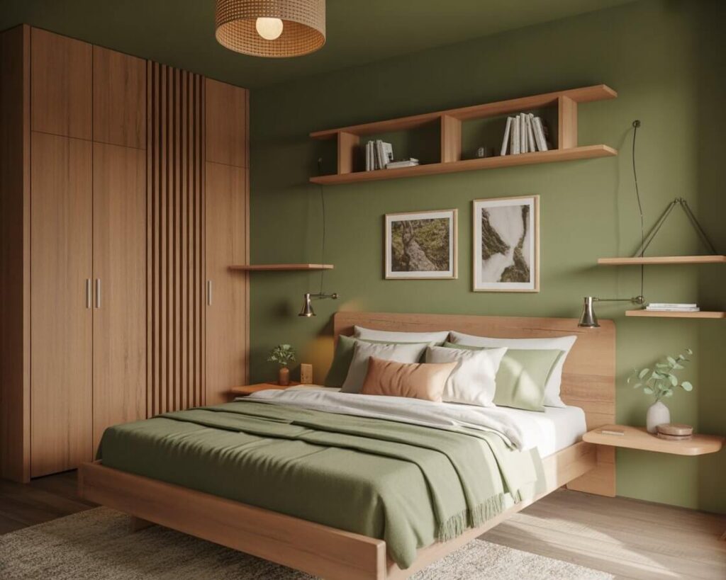 Nature lovers, this one’s for you. Combining sage green with natural wood creates an organic sanctuary that practically breathes tranquility. Whether you prefer light oak or deep walnut, wood and sage green are basically best friends.