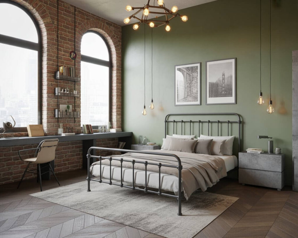 Who says industrial has to mean all gray and black? Sage green adds life to industrial bedrooms while maintaining that edgy, urban feel. The softness of sage balances the hardness of metal and concrete beautifully.