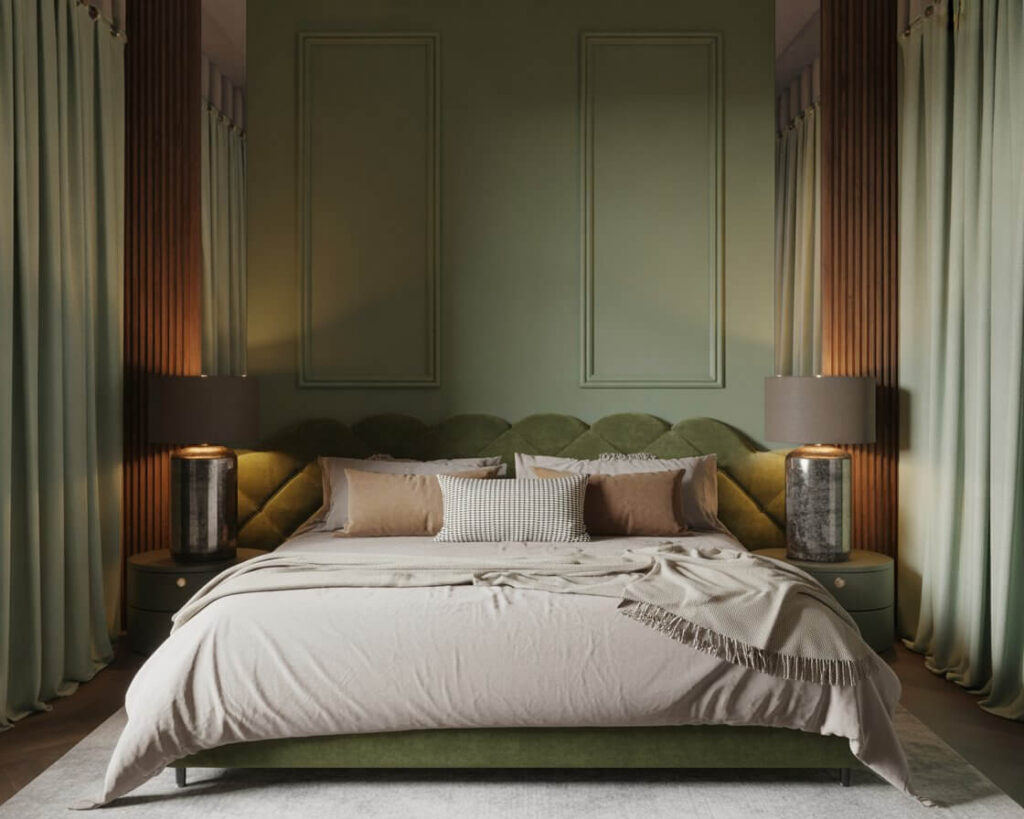 Talk about luxury! Sage green velvet takes this already sophisticated color to new heights of elegance. Whether it’s a velvet headboard, curtains, or throw pillows, this texture adds instant glamour.