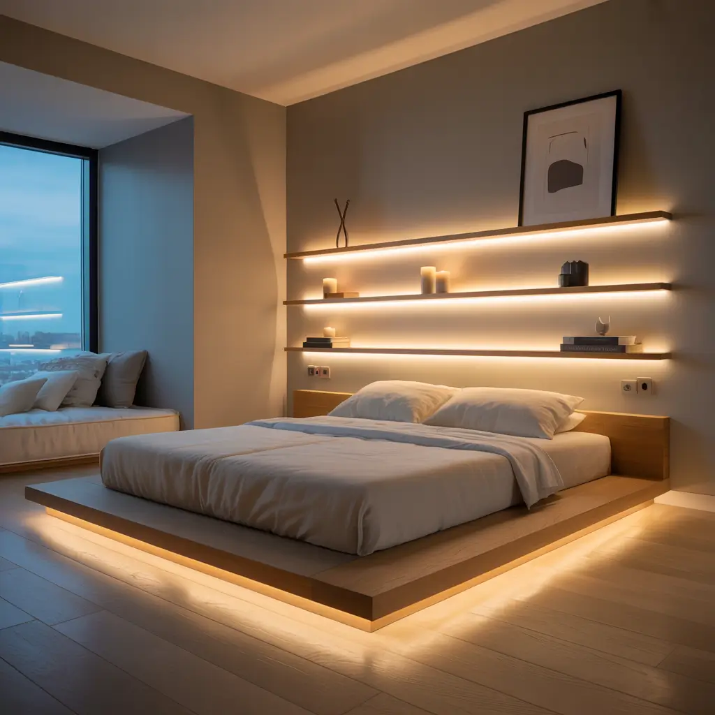 Adding LED lighting to above-bed shelves creates this amazing ambiance that transforms your bedroom. My backlit shelves provide perfect reading light while creating a gorgeous glow that makes evenings feel magical.
