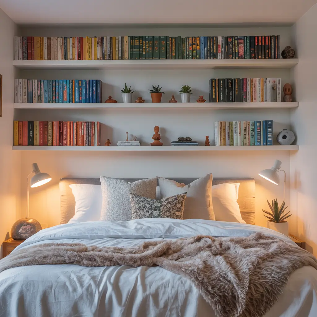Creating a bookshelf nook above your bed turns dead space into a personal library. My bedroom features a U-shaped arrangement of shelves that creates this cozy reading nook feel, complete with built-in reading lights.