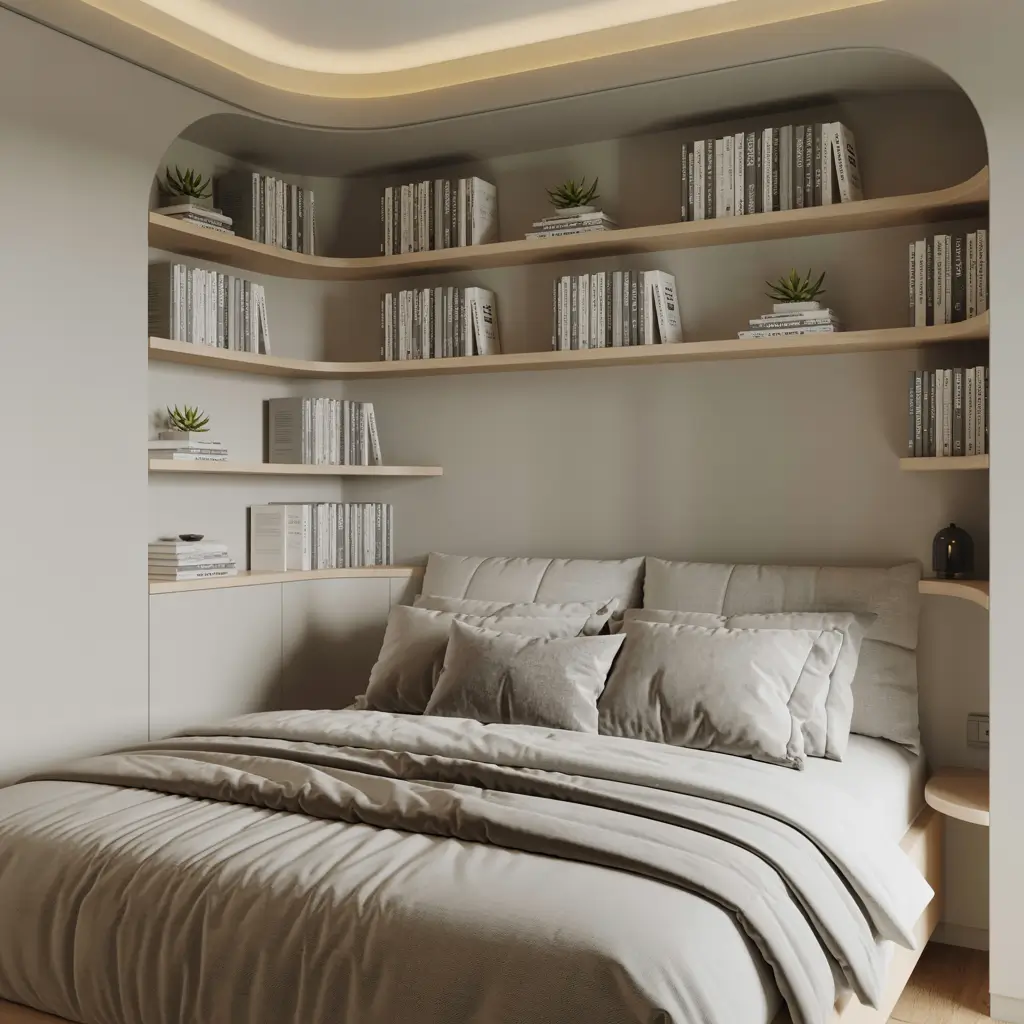 Curved shelves soften the typical harsh angles above beds. My corner bed setup features gently curved shelves that follow the natural flow of the room rather than fighting against it.