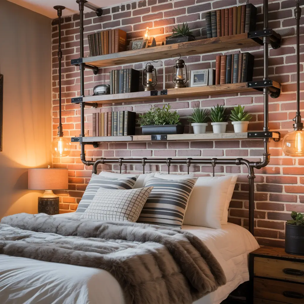 Industrial shelving brings that converted loft vibe to any bedroom. My industrial pipe shelves combine black iron pipe with warm wood, creating perfect balance between raw and refined.