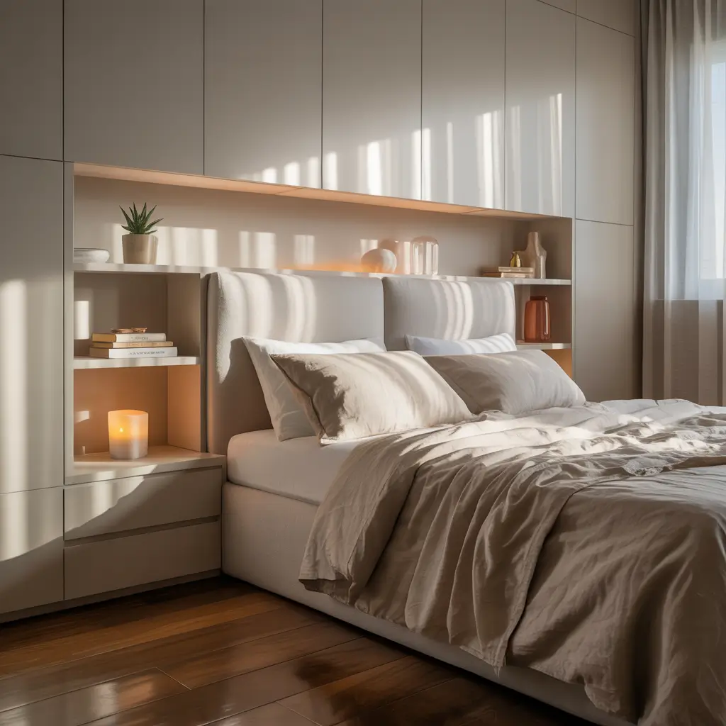 Combining headboard and shelving creates seamless bedroom storage. My built-in headboard includes floating shelves that extend outward, providing perfect bedside storage without extra furniture.